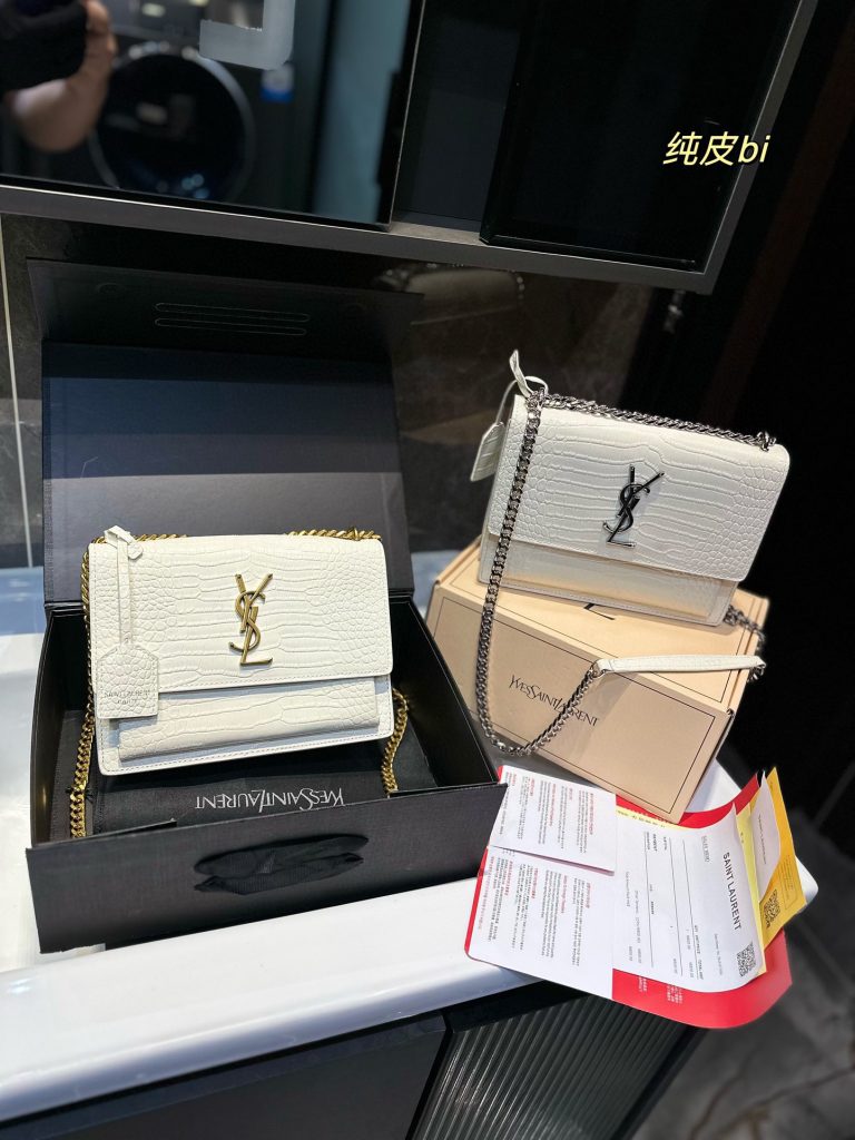 Ville romantique, sac Yves Saint Laurent YSL sunset Le sac Yves Saint Laurent YSL sunset est vraiment synonyme de romantisme exquis, de lignes douces et discrètes, de forme assez large, de style robuste, de cuir de vache noir brillant avec un logo doré, ce qui le rend plus avant-gardiste Taille rétro 25cm